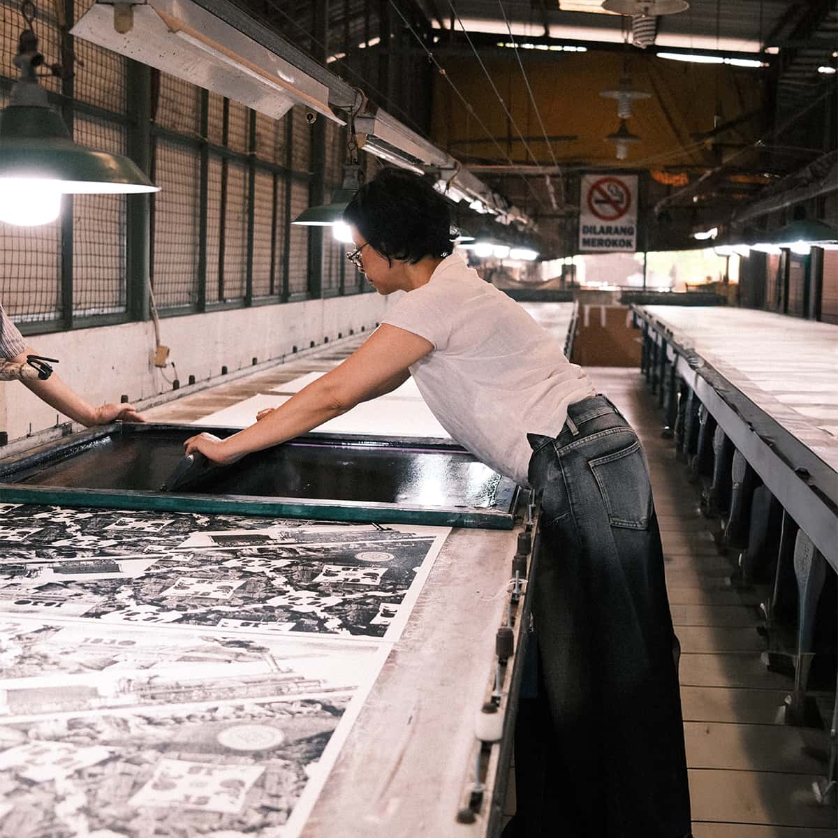 —Hand-pulled printing is a labour-intensive process requiring the skill of two to three artisans, while using significantly less water than automated machines. Heat curing and manual pressure can cause shrinkage or image variation, meaning each impression is unique—shaped by the reactions of humidity and pigment. At Tulisan, we embrace these natural imperfections as markers of authenticity, shifting perceptions of craftsmanship from uniformity to individuality. We strictly avoid materials and methods linked to animal cruelty, toxic chemicals, or environmental harm, ensuring that every design decision aligns with fair and ecological values. Our use of eco-friendly pigments yields organic impressions that convey emotional depth and authenticity. This approach sustains artisanal traditions, creates meaningful job opportunities, and empowers makers whose skills infuse each piece with character and cultural resonance.